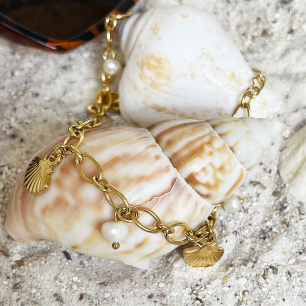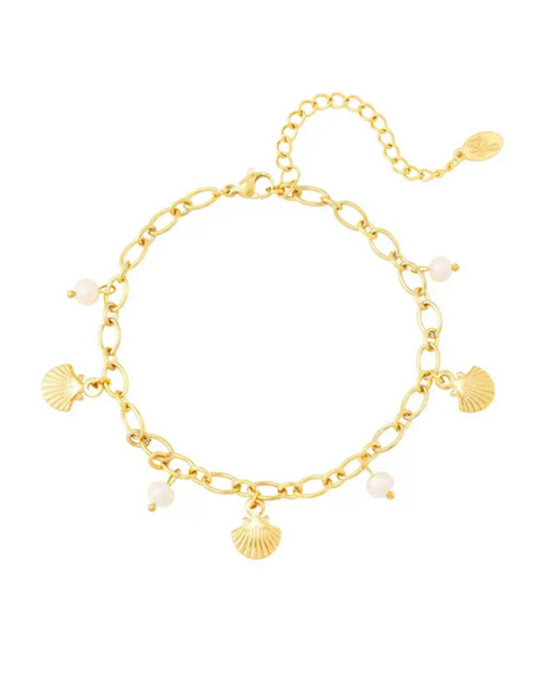 TREND ALERT! Dit leuke gouden enkelbandje komt met bedels schelpen en parels. perfect voor de zomer om jou outfit mee op te fleuren.
