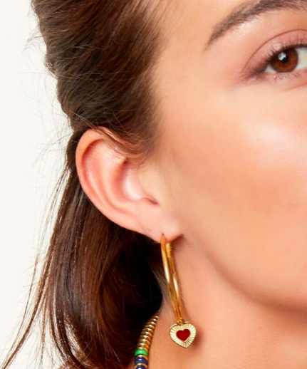 Hoops met hartjes bedel in de kleur rood. Deze oorbellen zijn gemaakt van stainless steel in combinatie met enamel in de kleur rood. De oorbellen hebben een lengte van 4 cm en zijn daarmee perfect te combineren met meerdere gouden oorbellen
