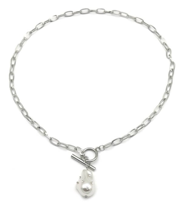 Deze leuke ketting is gemaakt van stainless steel en heeft een afmeting van 45cm. Opvallend detail: de sluiting van deze ketting heeft een parel met strass en bevind zich aan de voorkant, waardoor er een speels effect ontstaat!