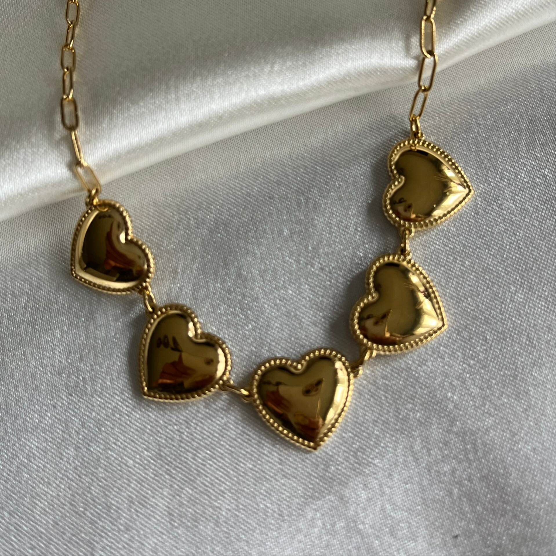 Hoe leuk is deze gouden ketting met vijf hartjes! Mega trendy en perfect te combineren met meerdere leuke kettingen! De ketting is daarnaast superleuk te combineren met meerdere sieraden en accessoires. De ketting is gemaakt van stainless steel, en heeft een verstelbare lengte van 40cm tot 45cm.