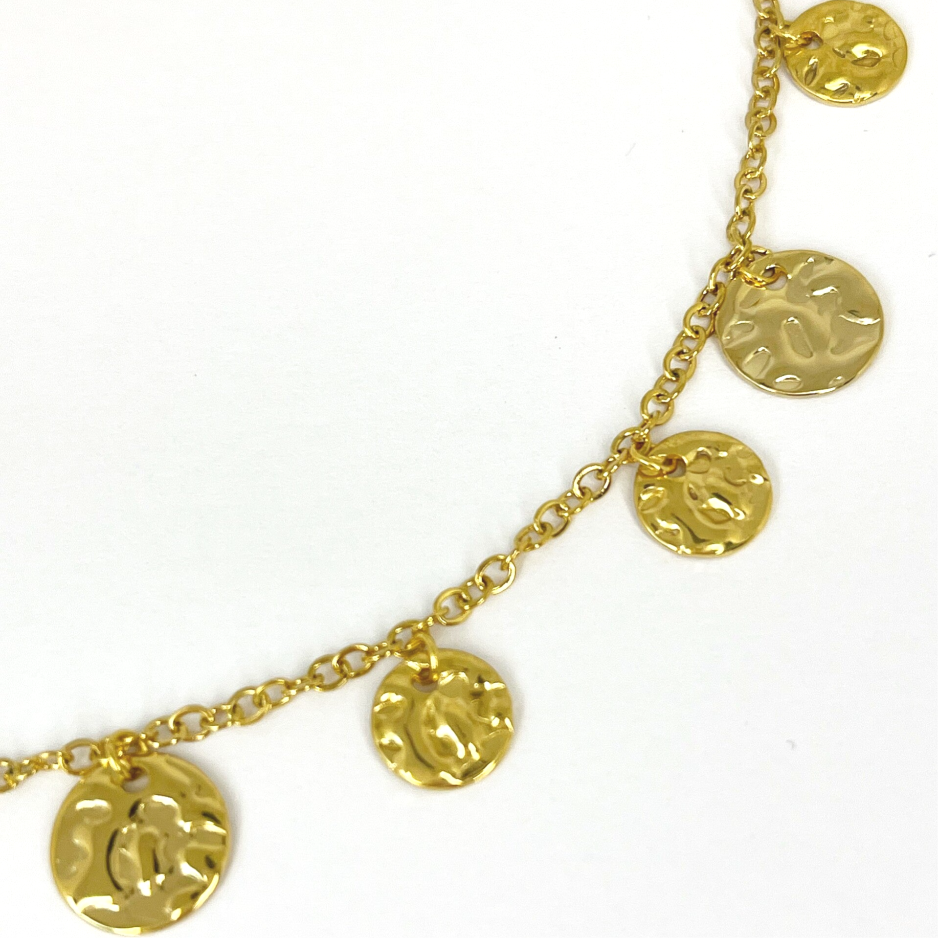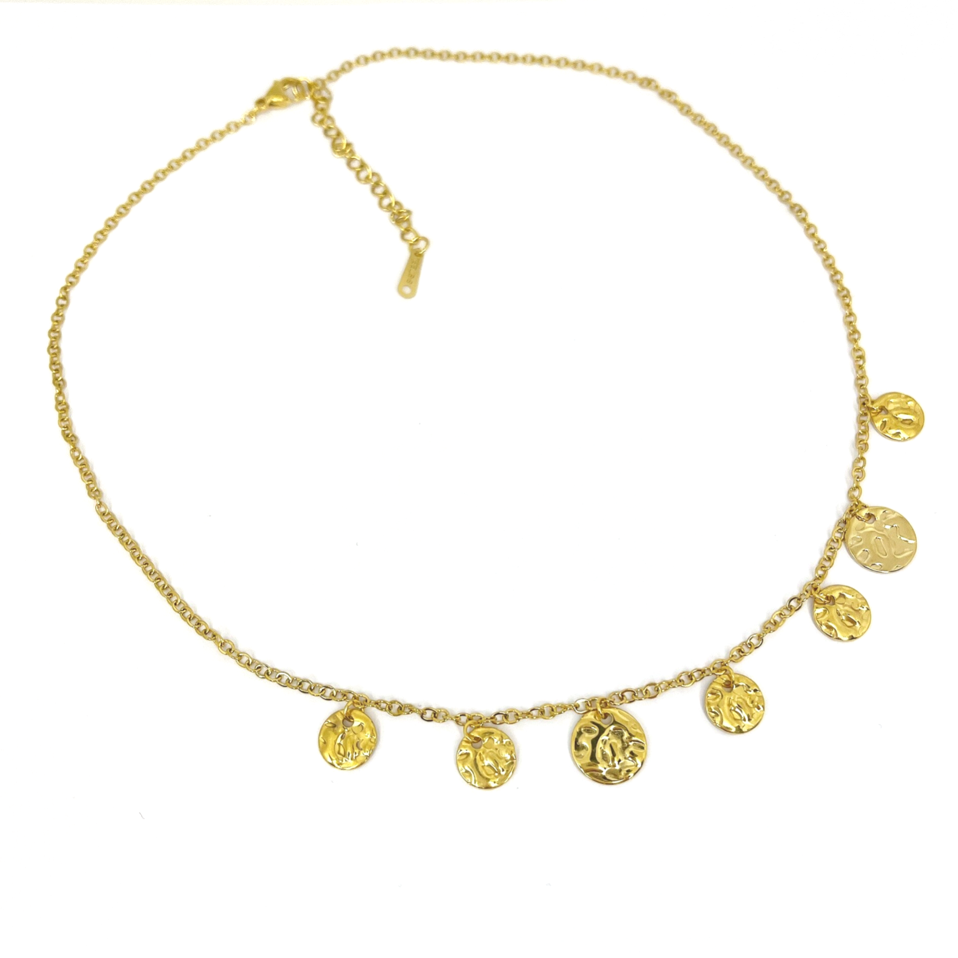Hoe leuk is deze gouden ketting met 7 muntjes! Mega trendy en perfect te combineren met meerdere leuke kettingen! De ketting is daarnaast superleuk te combineren met meerdere sieraden en accessoires. De ketting is gemaakt van stainless steel, en heeft een verstelbare lengte van 40cm tot 45cm.