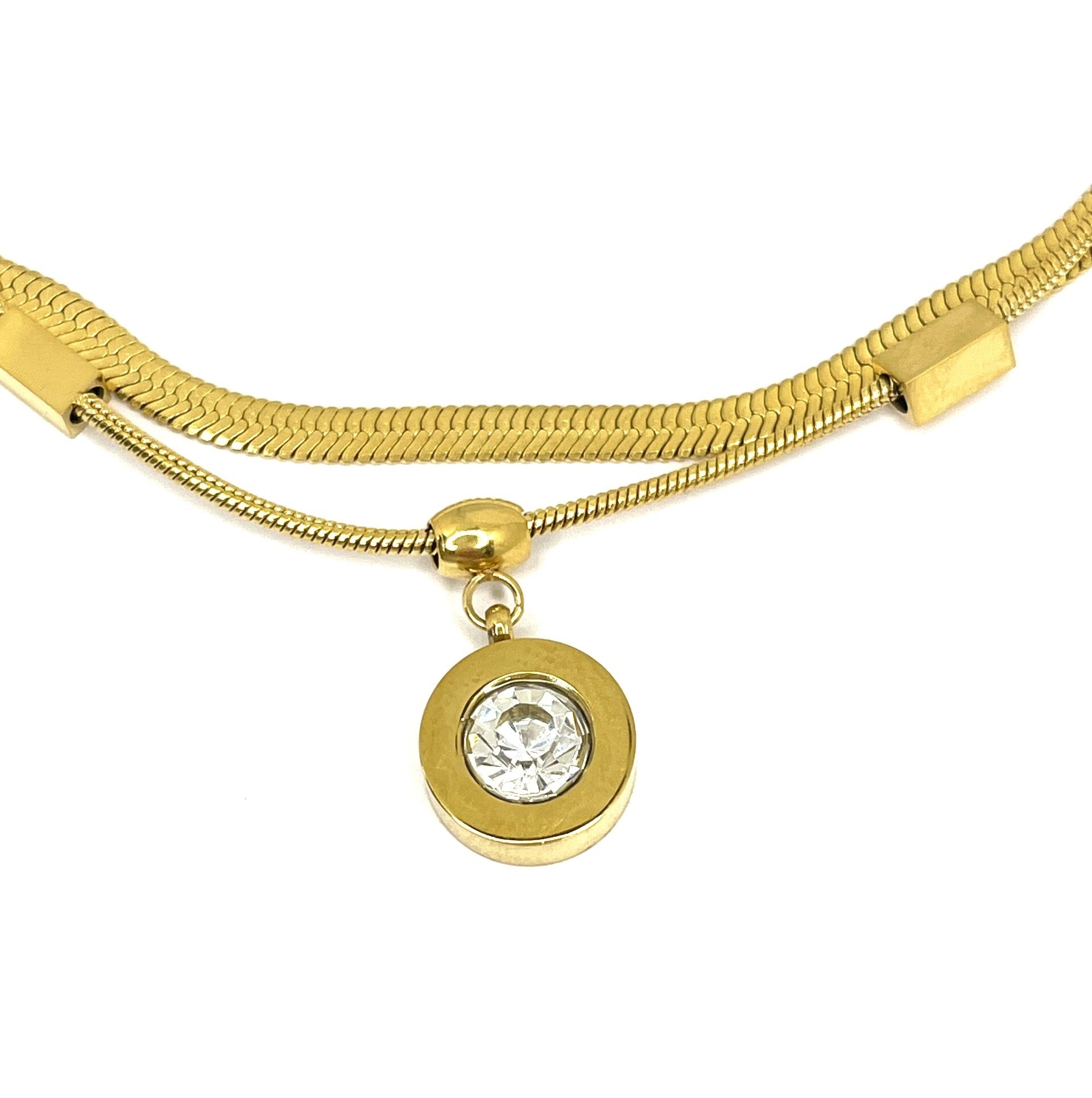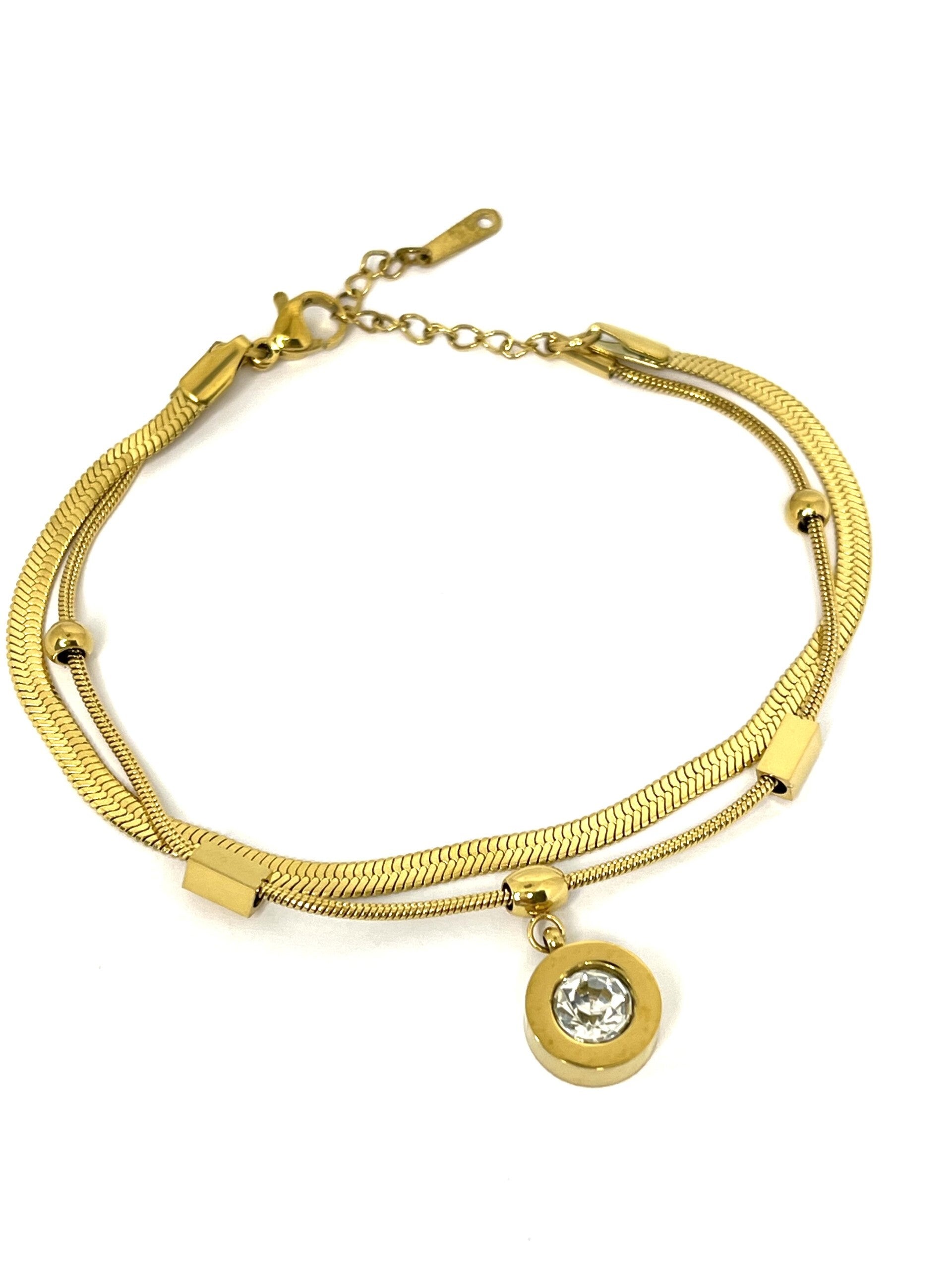 Deze prachtige dubbele armband heeft leuke details en een mooie zirkoon bedel. Deze armband is overal mee te combineren en op veel manieren te stylen, chic en casual. Gemaakt van stainless steel en heeft een verstelbare sluiting te dragen van 17 tot 21 cm.