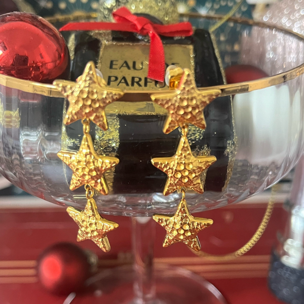 Deze oorbellen zijn van stainless steel. Hoe mooi zijn deze oorbellen met 3 gouden sterren! De sterren zijn voorzien van structuur waardoor de oorbellen er luxe uitzien! De totale afmeting van de oorbellen is 4 cm en wegen maar 8,9g, perfect om deze oorbellen als statement sieraad te dragen! Deze oorbellen kunnen gecombineerd worden met kleinere oorbellen.