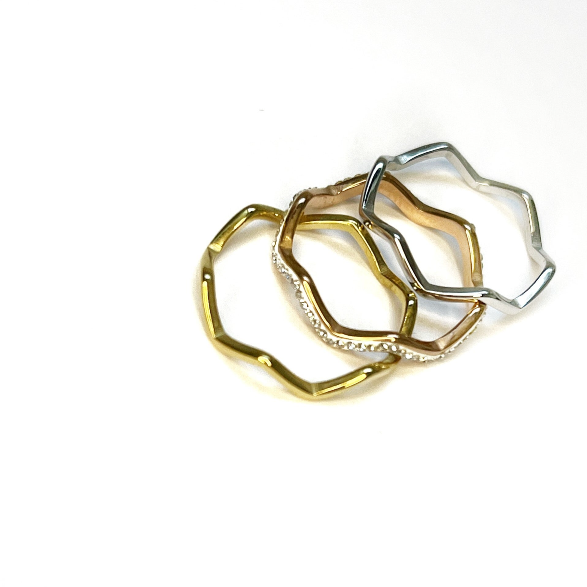 Nooit meer kiezen tussen goud of zilver? met deze ringen combineer je alles met elkaar. Deze mooie ringen zijn gemaakt van stainless steel, daardoor verkleurd het niet, het rosé kleurige ringetje is afgewerkt met strass steentjes voor een feestelijke look. draag ze samen voor een stylishe look maar ook afzonderlijk van elkaar erg leuk. Maat 17.