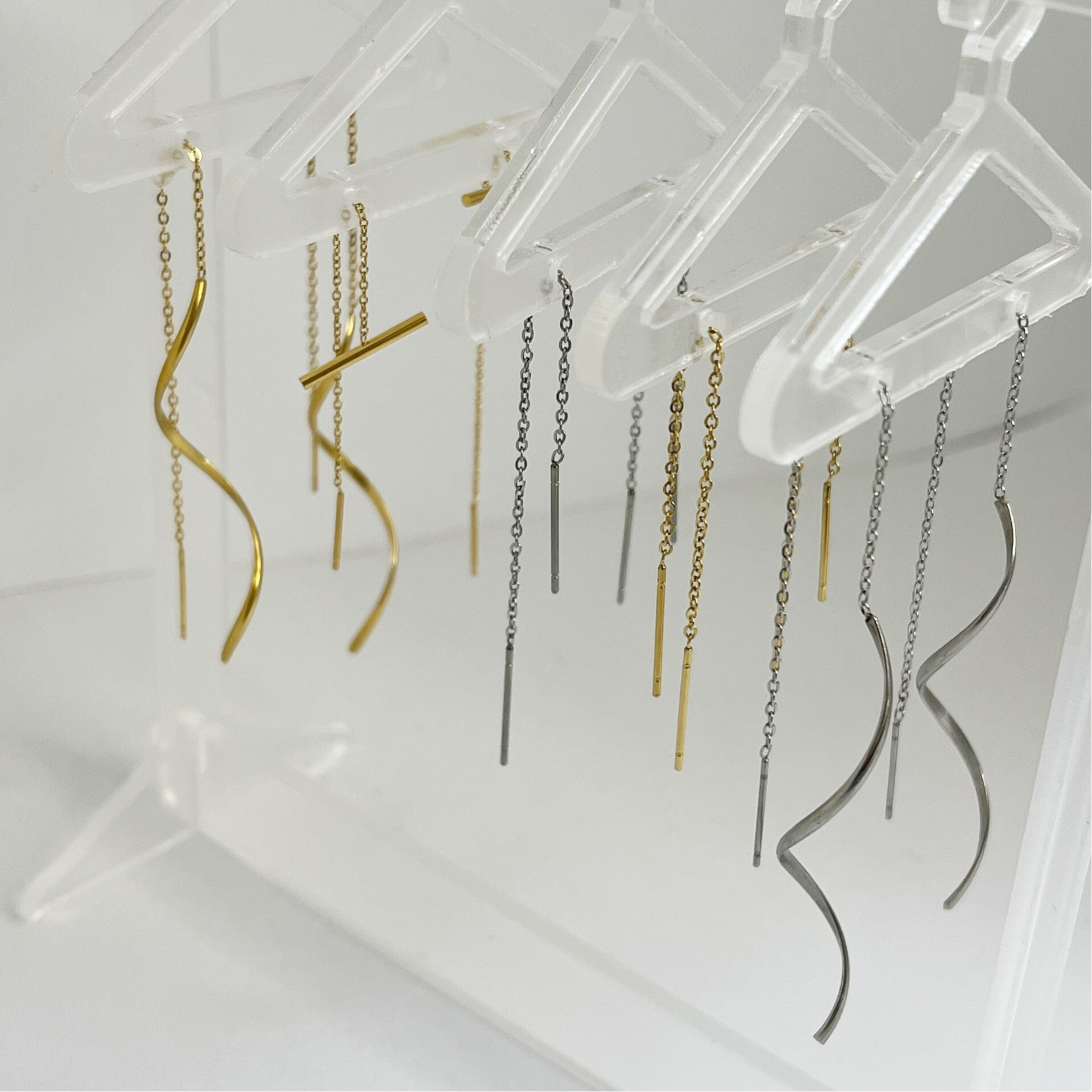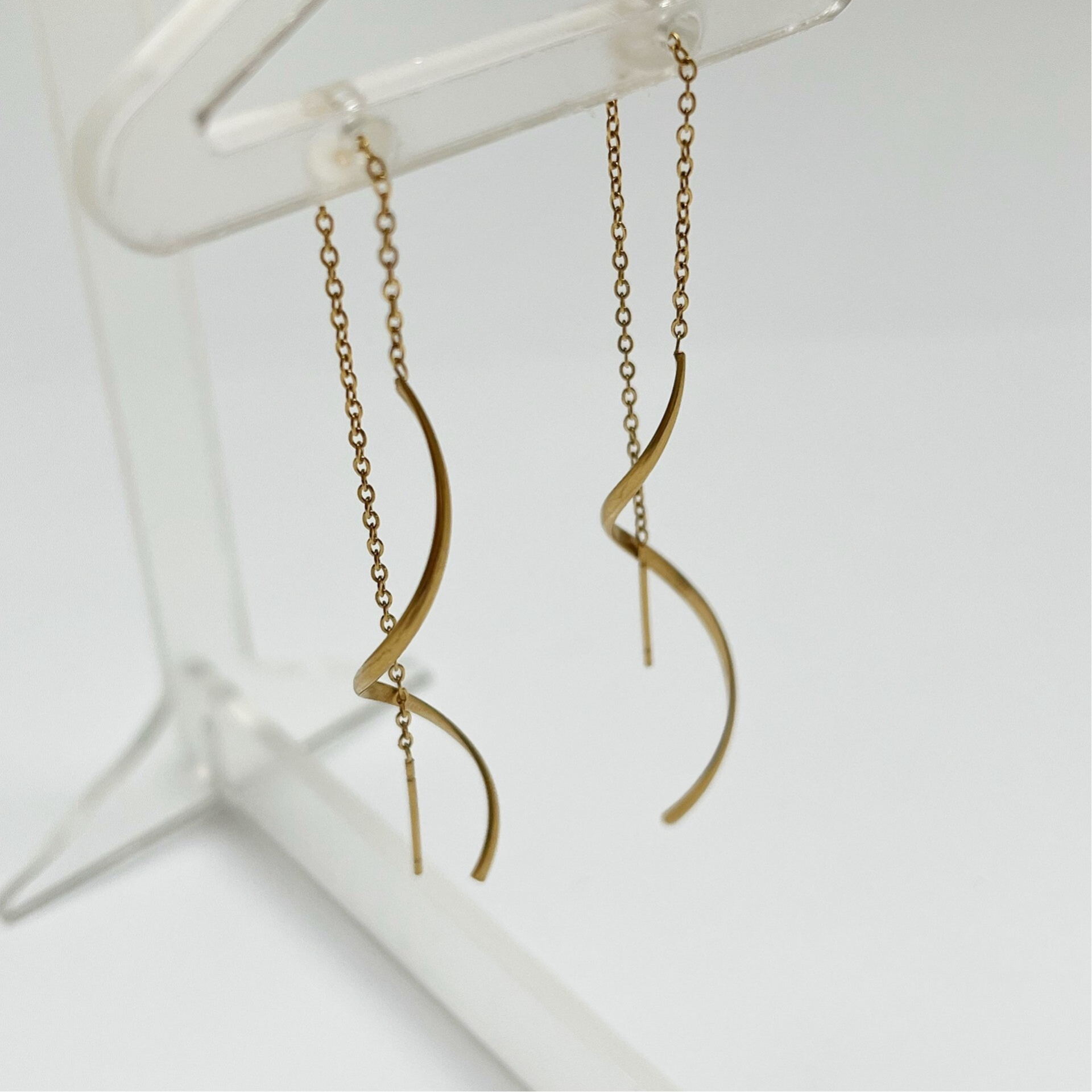 Hoe leuk zijn deze doortrek oorbellen, heel subtiel maar toch bijzonder door de spiraalvorm. Deze oorbellen zijn erg leuk om zo te dragen maar ook heel mooi te combineren met meerdere oorbellen. De oorbellen zijn heel licht van gewicht en zijn 13cm lang, gemaakt van stailess steel.