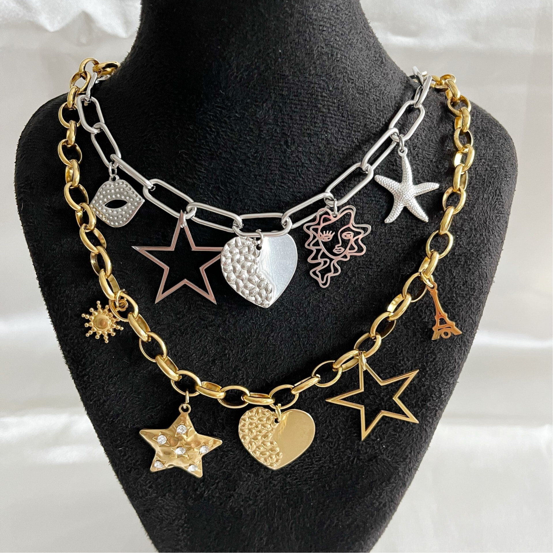 Super leuke unieke eigen ontworpen handgemaakte ketting! De ketting heeft een wat grotere schakel en 5 verschillende bedels. Deze beauty is helemaal gemaakt van stainless steel en heeft een verstelbare lengte van 40 tot 47 cm.