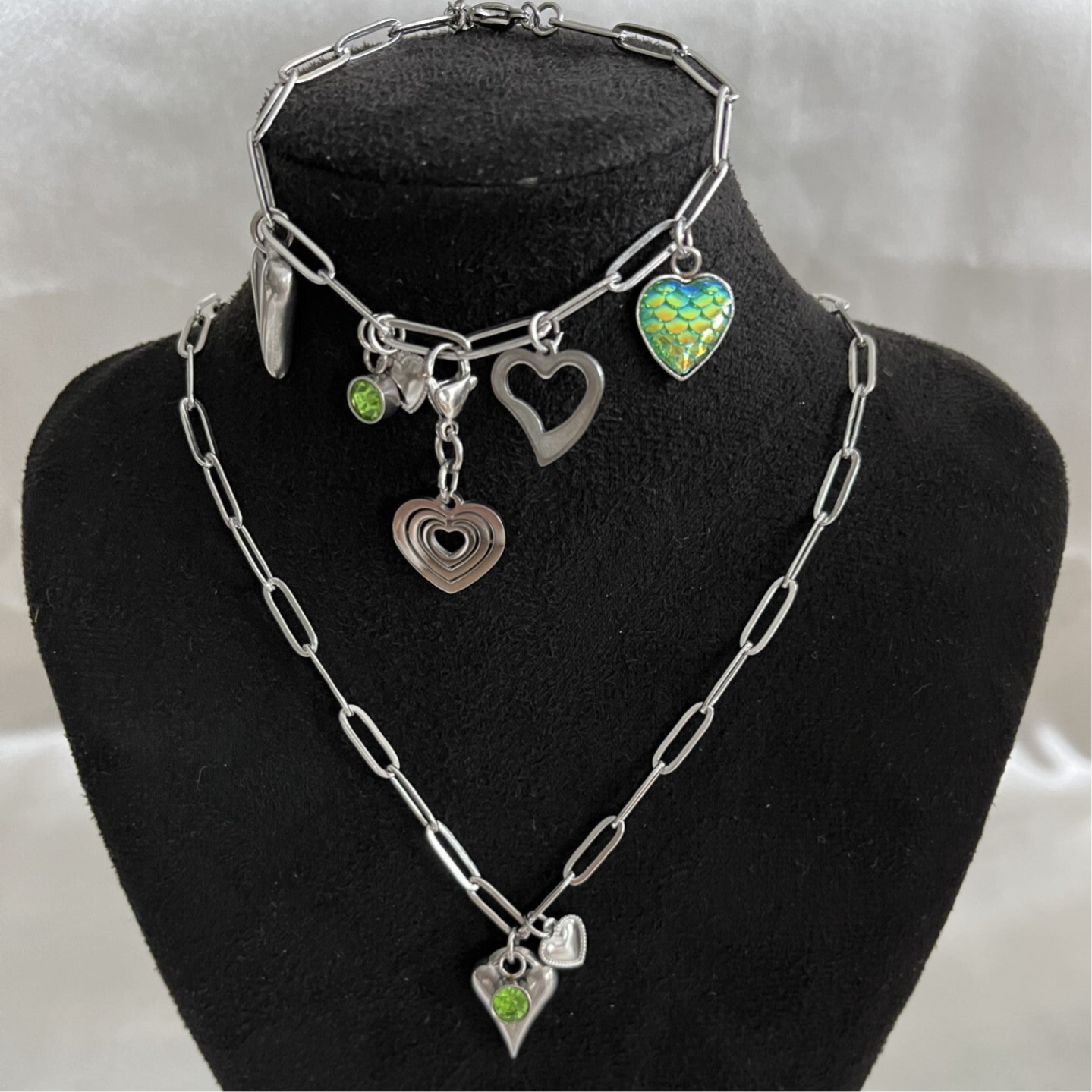 Super leuke unieke eigen ontworpen handgemaakte ketting! De ketting heeft een wat grotere schakel en heeft verschillende bedels 1 grote en 2 kleinere waarvan 1 met een mooi groen steentje. Deze beauty is helemaal gemaakt van stainless steel en heeft een verstelbare lengte van 44 tot 47 cm. Ook heel leuk om met de bijpassende armband te combineren.