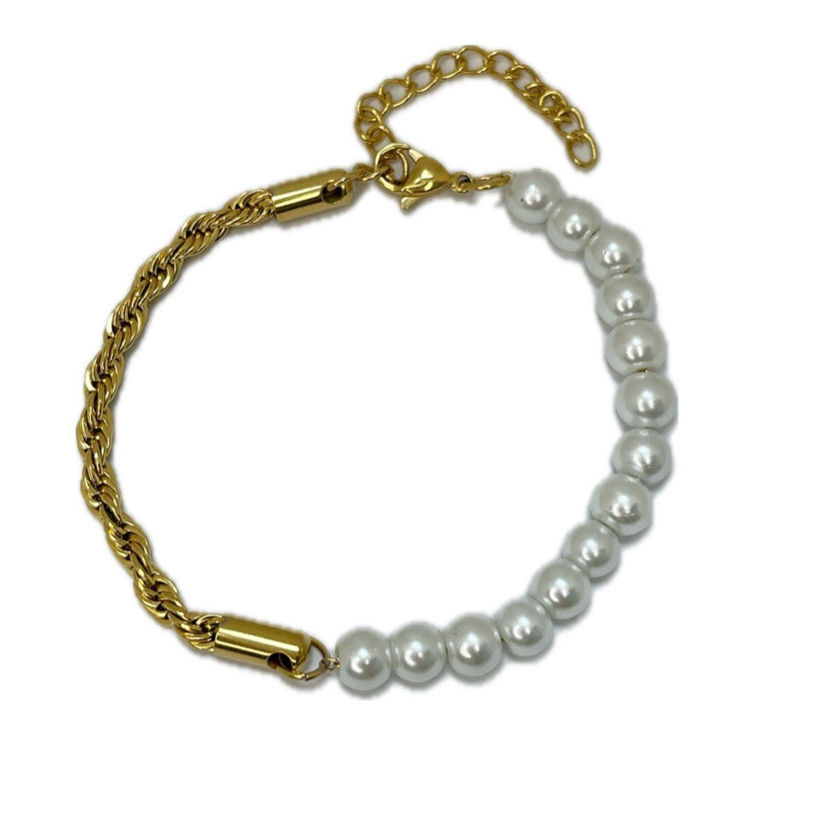 Deze armband is een combinatie van een gedraaide gouden schakel en parels. De armband is perfect te combineren met meerdere subtiele armbandjes waardoor je een speelse look creëert. Ook is deze armband perfect enkel te dragen! De armband is gemaakt van Stainless steel en heeft een verstelbare sluiting waardoor de armband vanaf 17cm tot en met 22cm gedragen kan worden.