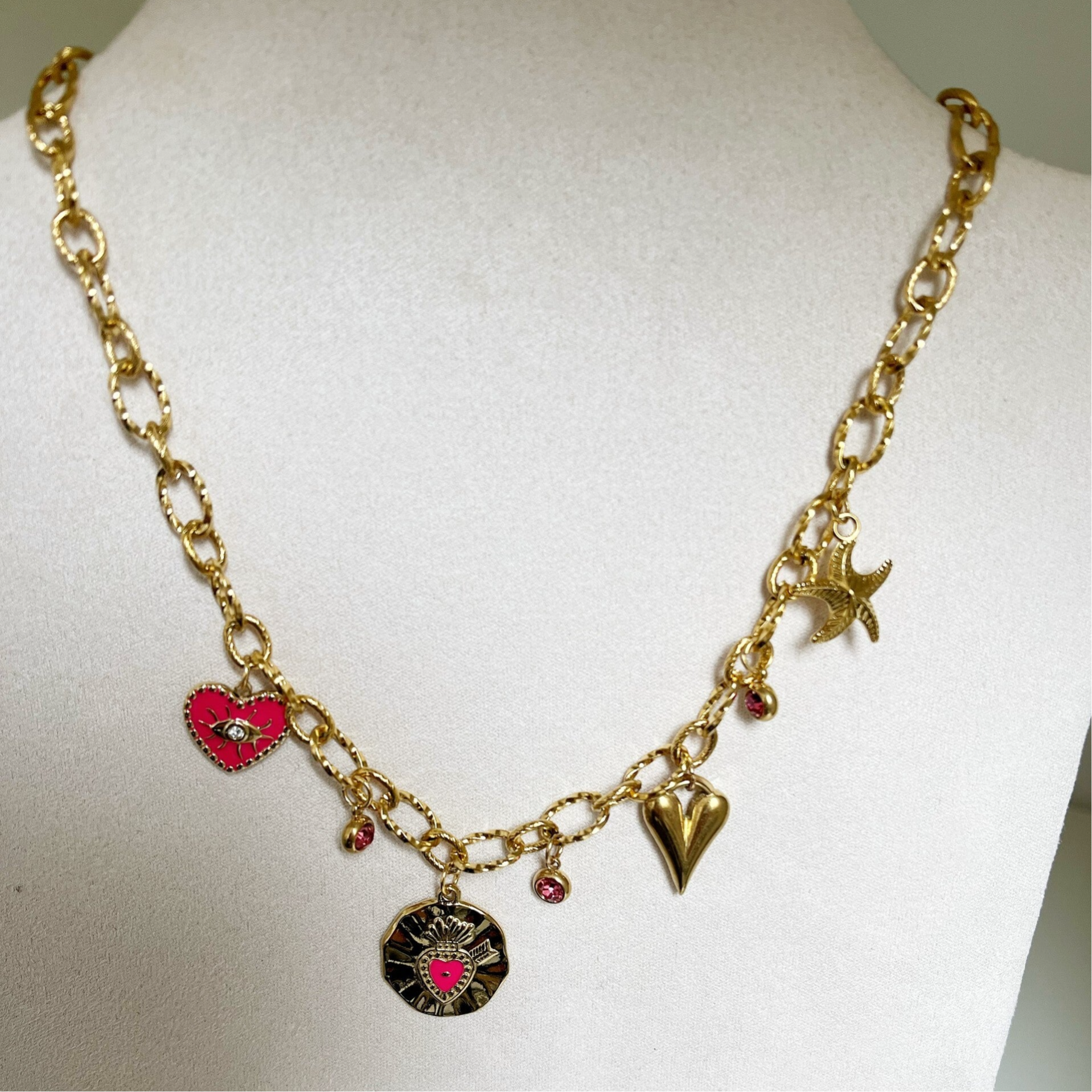 Super leuke unieke eigen ontworpen handgemaakte ketting! De ketting heeft een wat grotere schakel en 7 verschillende bedels. Deze beauty is helemaal gemaakt van stainless steel en heeft een verstelbare lengte van 40 tot 45cm.