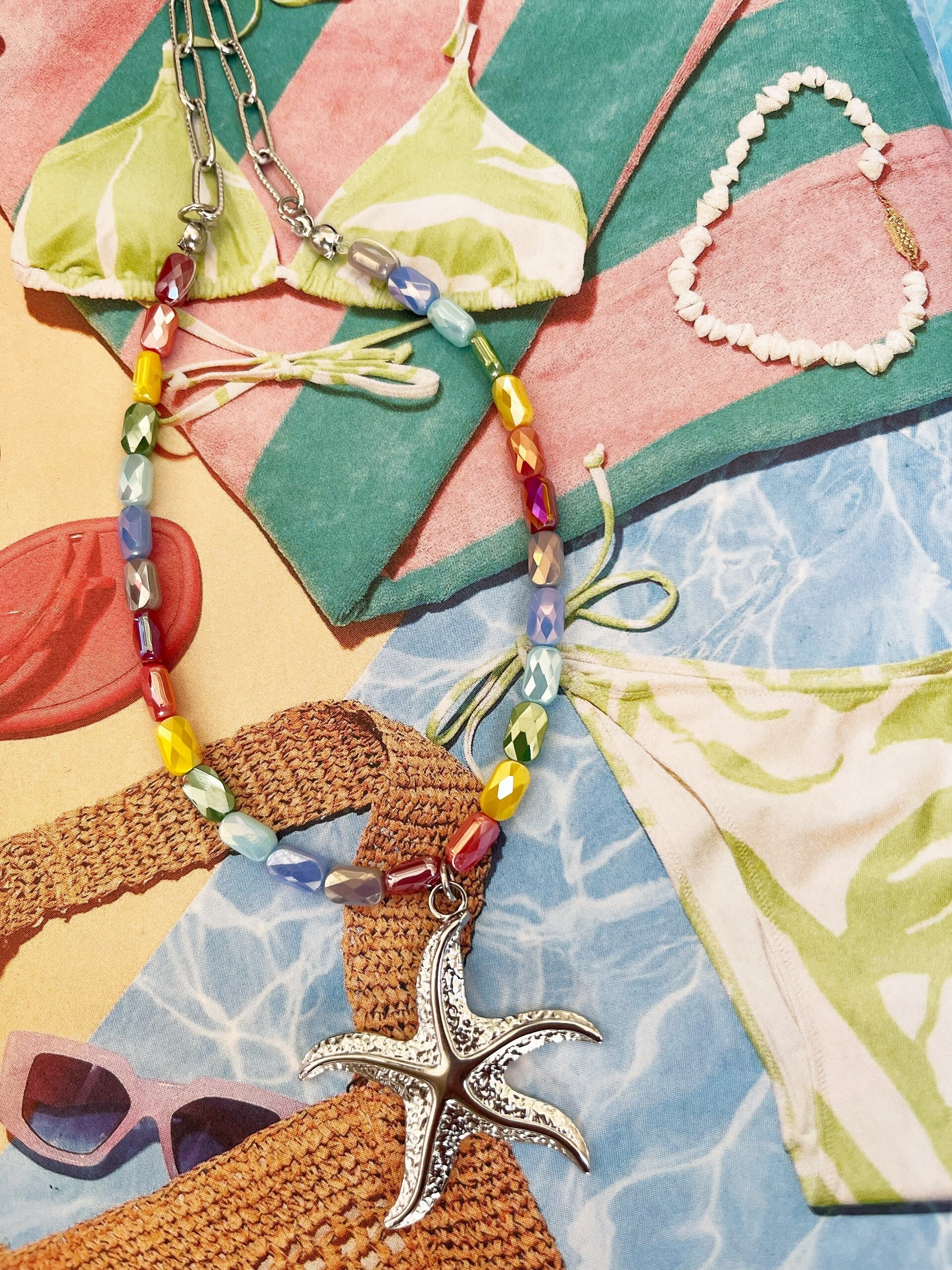 Kom helemaal in de vakantie sfeer met onze mooie zeester ketting. Shelpen, zeesterren, bloemen, vlinders de trend van deze zomer. Deze ketting is eigen ontwerp en handgemaakt dus uniek, gemaakt van stainless steel en glas kralen. Verstelbare lengte van 41 tot 46 cm. Leuk om met bijpassende sieraden te combineren en zo jouw outfit helemaal af te stylen.