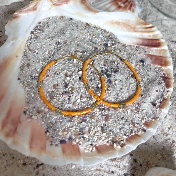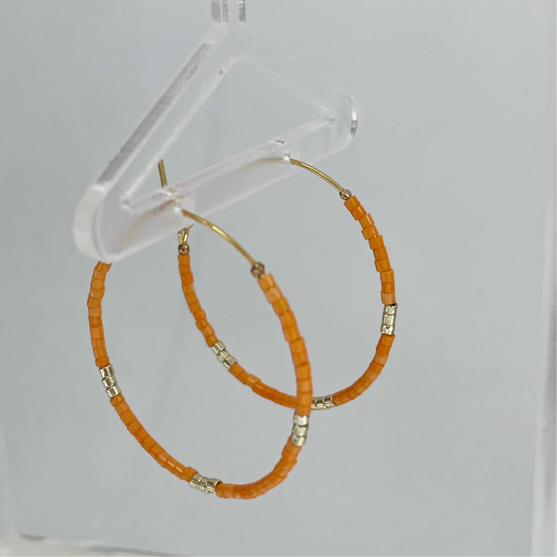 Deze oranje hoops zijn superlicht van gewicht en heel erg leuk om met andere sieraden te combineren. De oorbellen zijn gemaakt van stainless steel en glaskralen. Afmeting 4cm