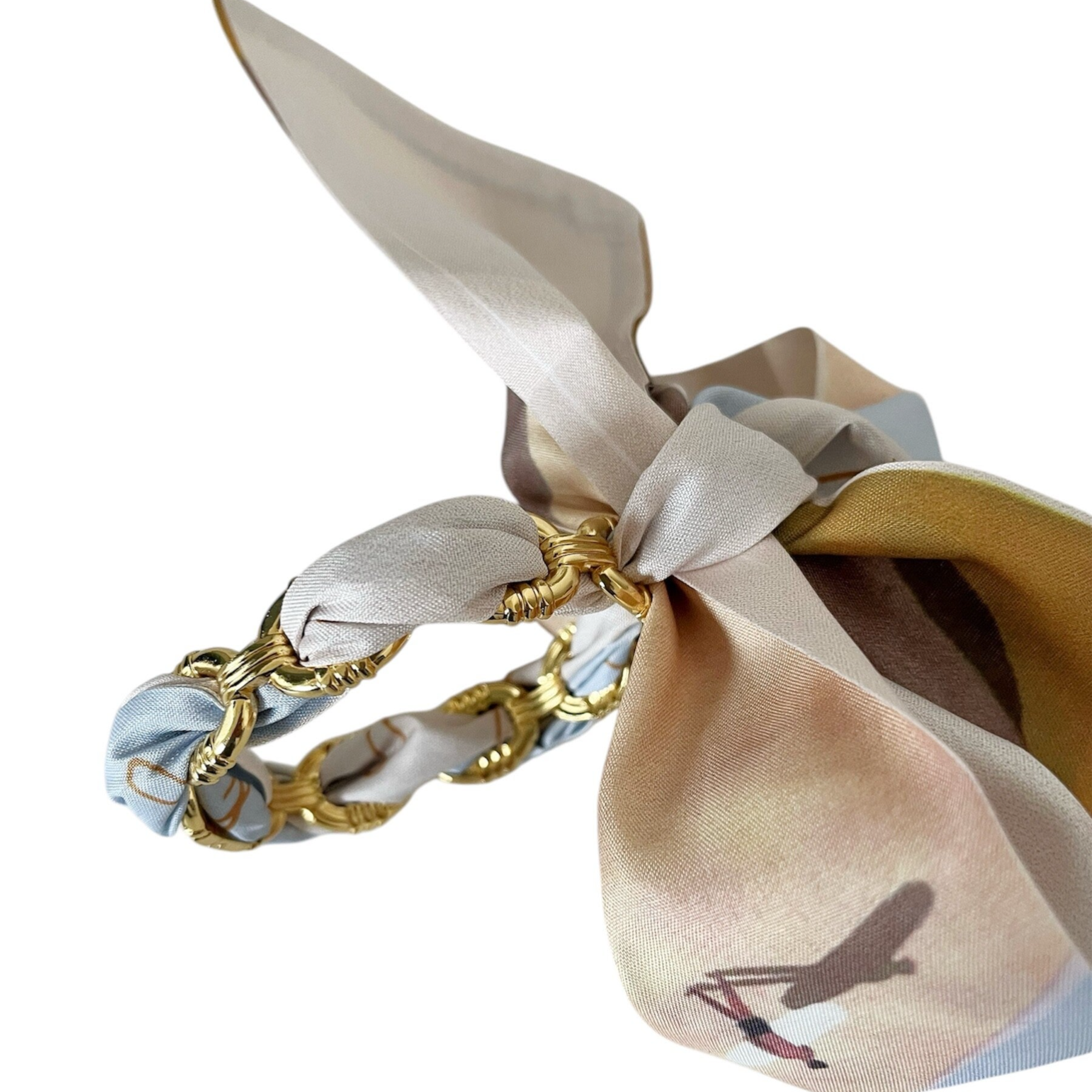 Hoe mooi is deze mooie armband en het is ook nog eens 2 in 1 en maak jij je outfit gelijk helemaal amazing. Deze bangle armband heeft schakels waar een leuk sjaaltje door heen is geweven, natuurlijk kun je het ook los van elkaar dragen. Het sjaaltje is ook mooi om in je haar of je nek te dragen maar ook leuk aan een tas. Armband is gemaakt van stainless steel en heeft een afmeting van 6 cm.