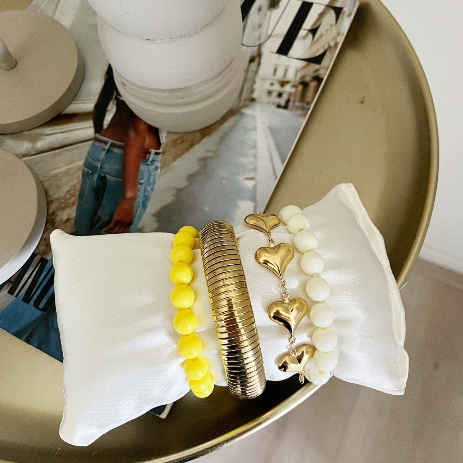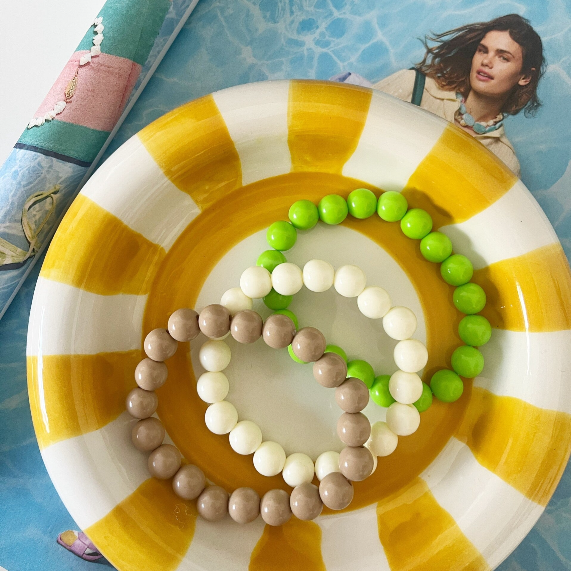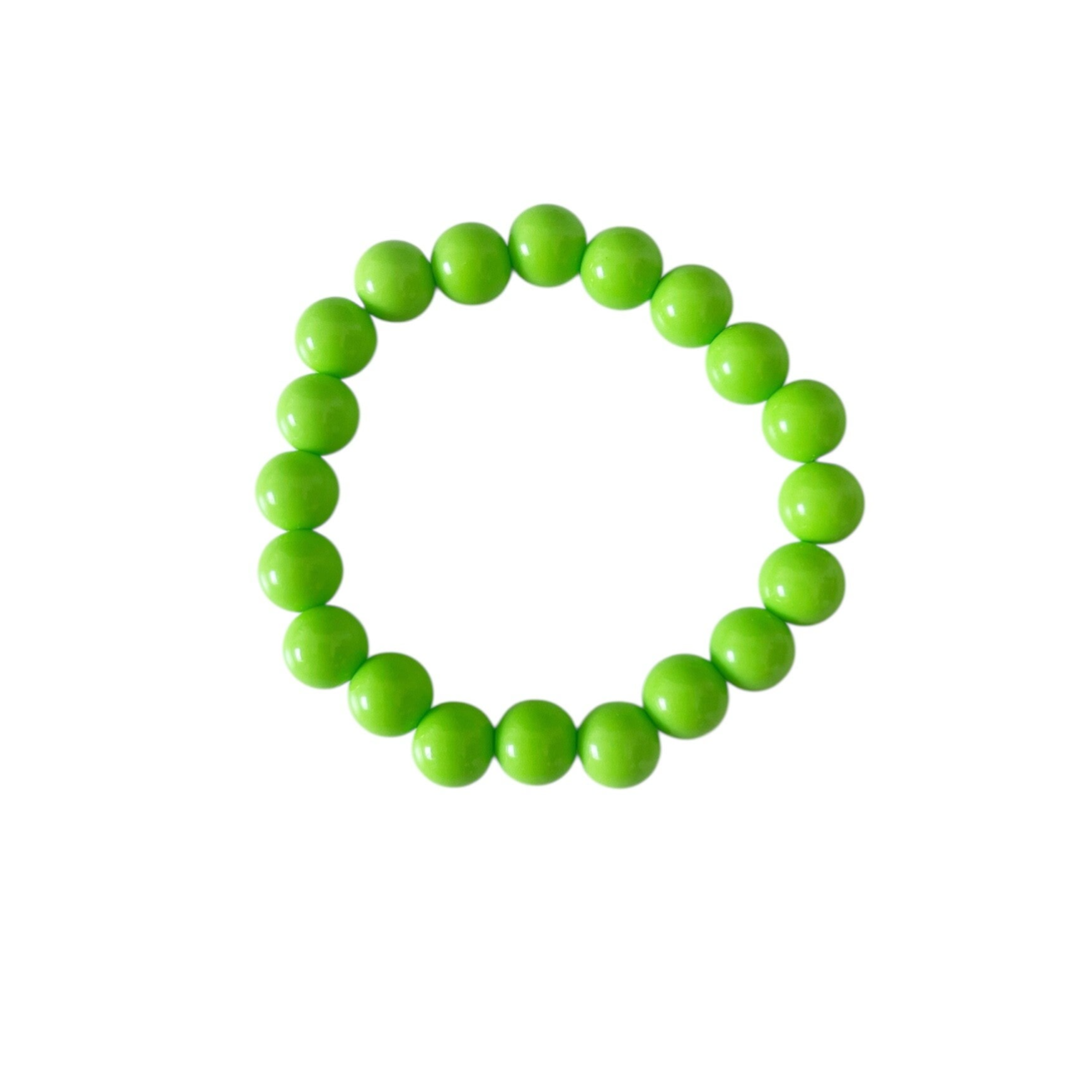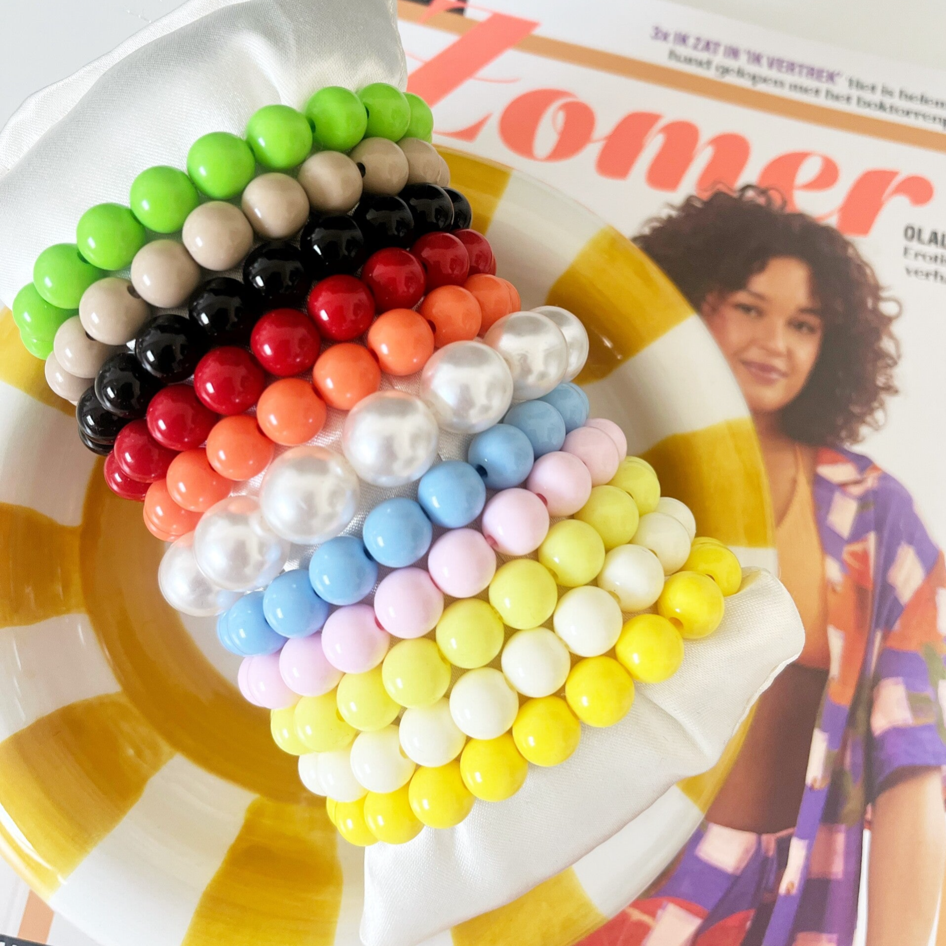 Deze kleurrijke armbanden hebben een mooie grove uitstraling, de kralen zijn 10mm. De armband is gemaakt van acryl en is rekbaar door stevig elastiek dus past altijd. Erg leuk om met meerdere armbanden in verschillende diktes, kleuren en materialen te combineren.