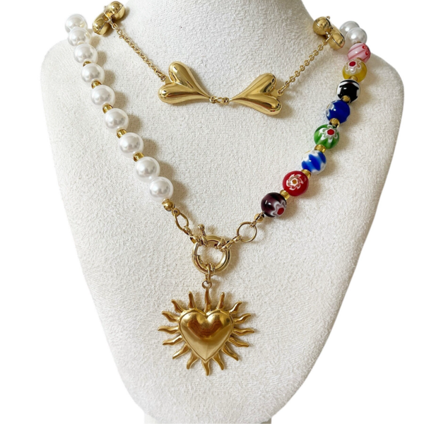 Een super mooie ketting die zegt 1 woord "Zomer" Deze ketting heeft alles, leuke parels, mooie vrolijke kleuren en en een bedel met een zon in de vorm van een hart. Ketting is van stainless steel en 50 cm lang, afmeting hart 4cm. Sluiting aan de voorkant.