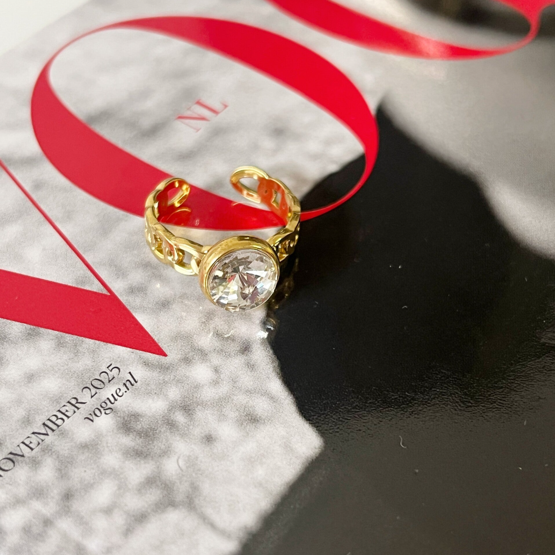 Deze ring met in de midden een zirkoon steen is toch te leuk! Super om deze ring als Eye-catcher te dragen of om de ring te combineren met meerdere ringen! De ring is gemaakt van stainless steel en is dankzij de verstelbare eigenschap perfect te dragen om elke vinger.