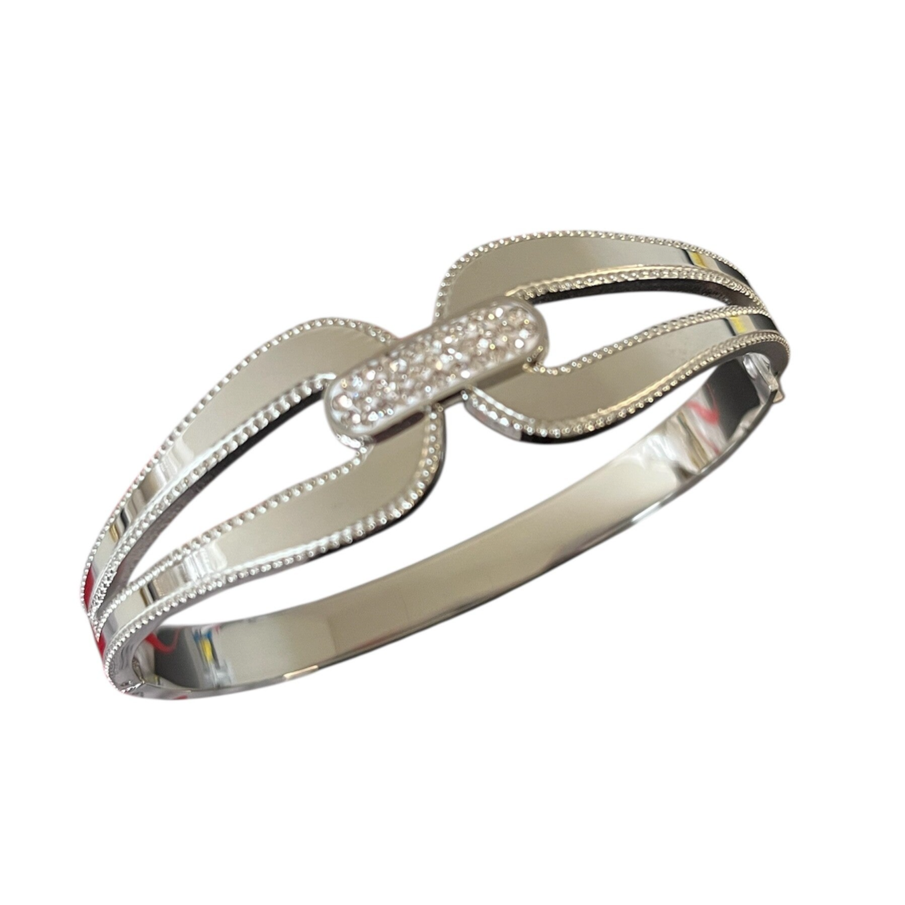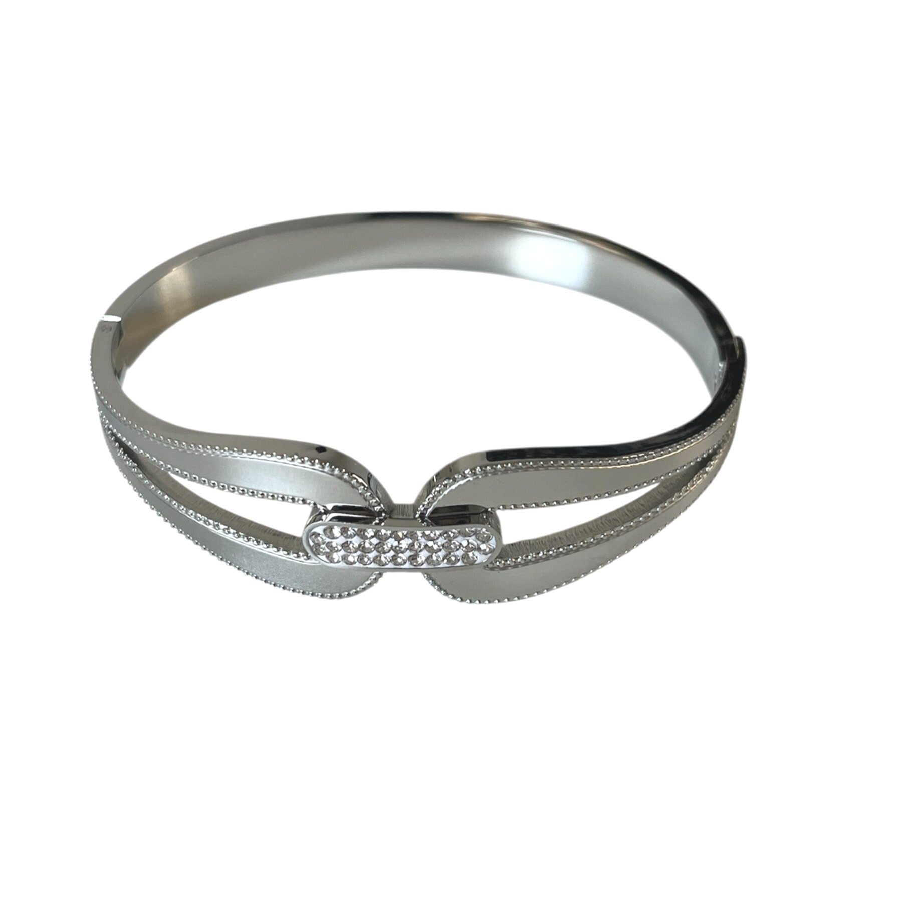 In love met deze mooie bangle armband! Voeg deze must have toe aan jouw collectie! Super om meerdere, verschillende bangle armbanden met elkaar te combineren. De armband is gemaakt van stainless steel en heeft als leuk detail strass steentjes. De afmeting van de armband is 6 cm.