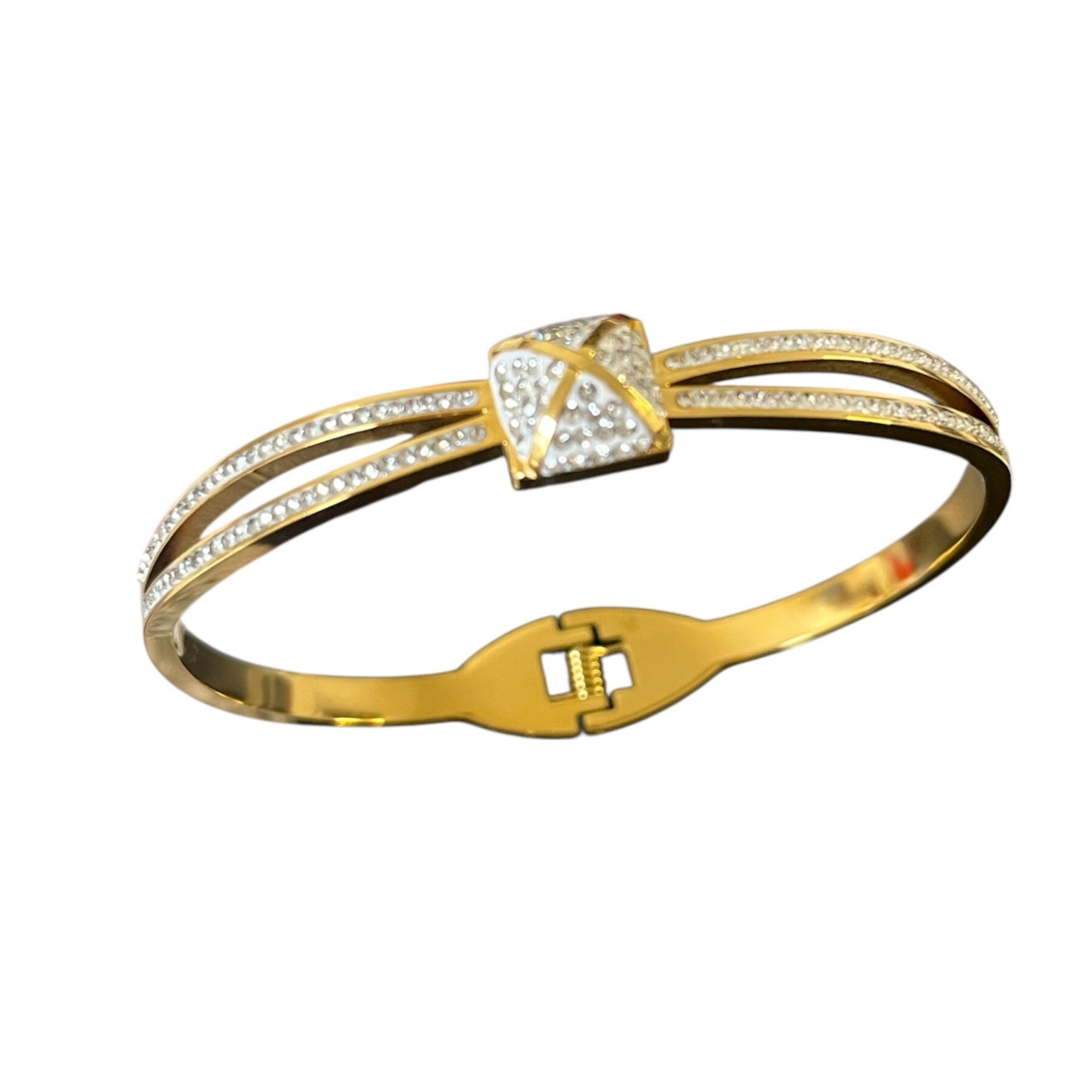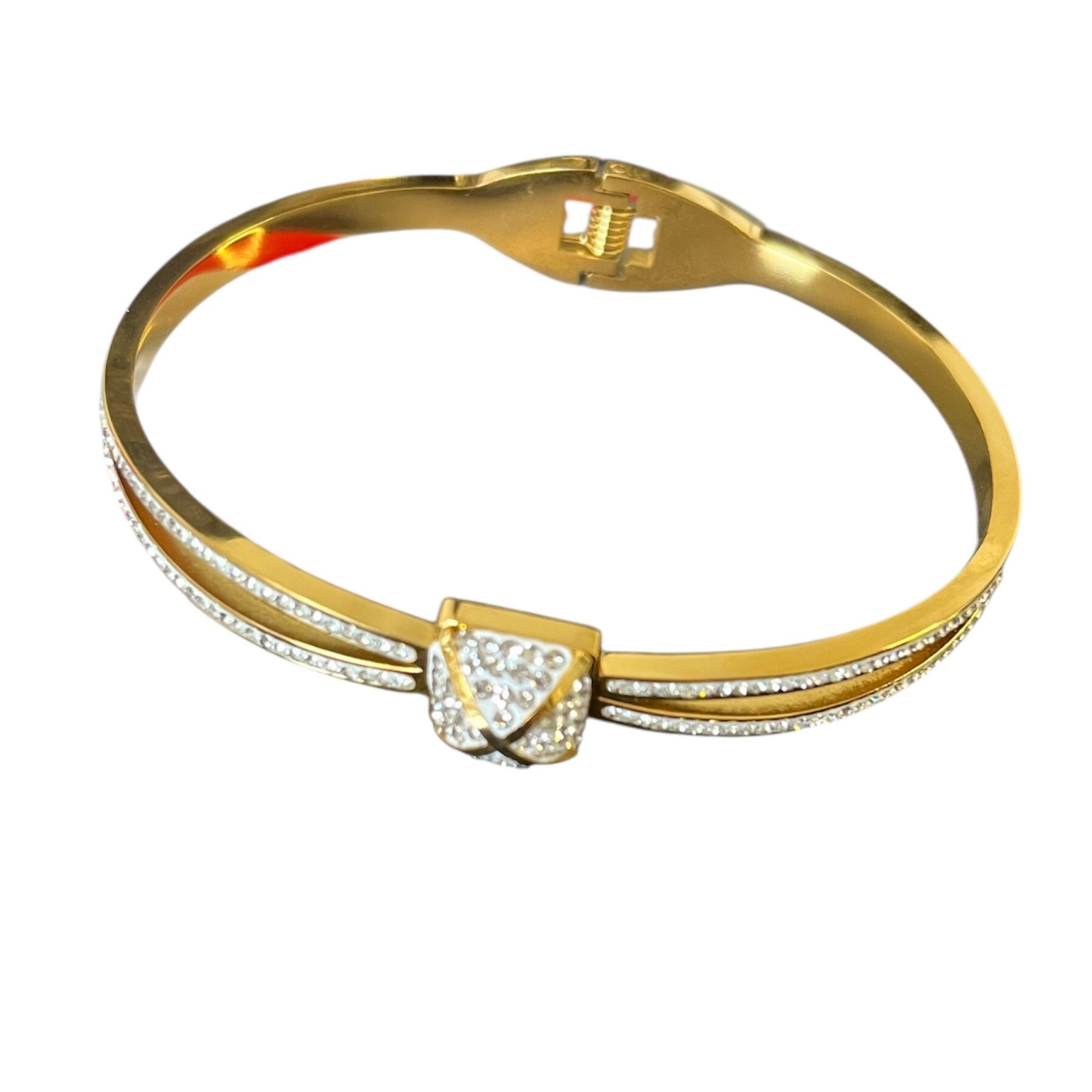 In love met deze mooie bangle Voeg deze must have toe aan jouw collectie! Super om meerdere, verschillende bangle armbanden met elkaar te combineren. De armband is gemaakt van stainless steel en heeft als leuk detail 6 strass steentjes. De afmeting van de armband is 6 cm.